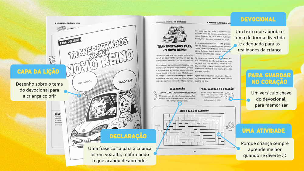 Os devocionais foram escritos numa linguagem prática e divertida, para que a criança se identifique e entenda como cada princípio ensinado pode ser aplicado em seu dia a dia.
