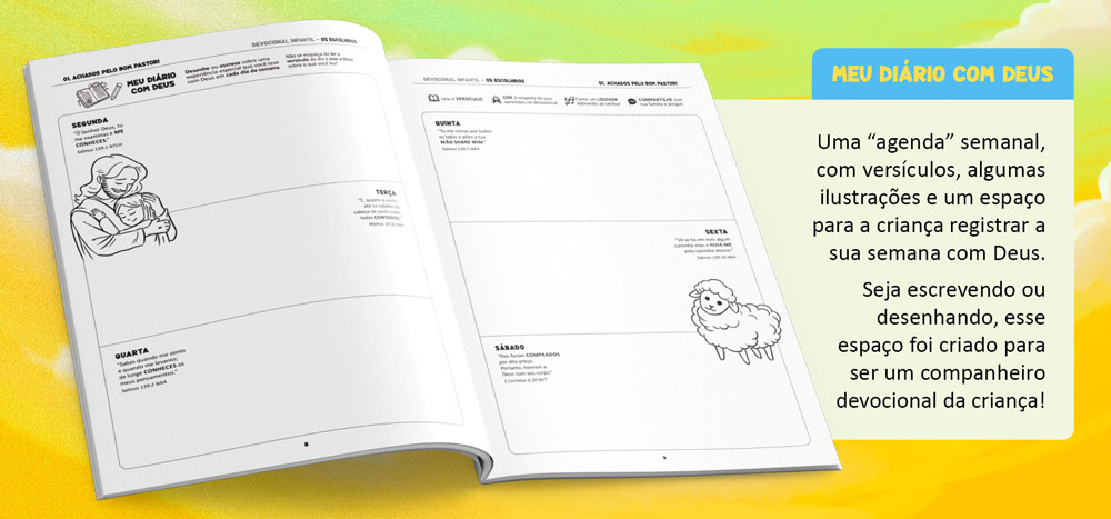 Além do conteúdo devocional e de suas atividades, criamos o Meu Diário com Deus, com versículos diários e um espaço para a criança fazer anotações e expressar o que o Pai está falando ao seu coração!